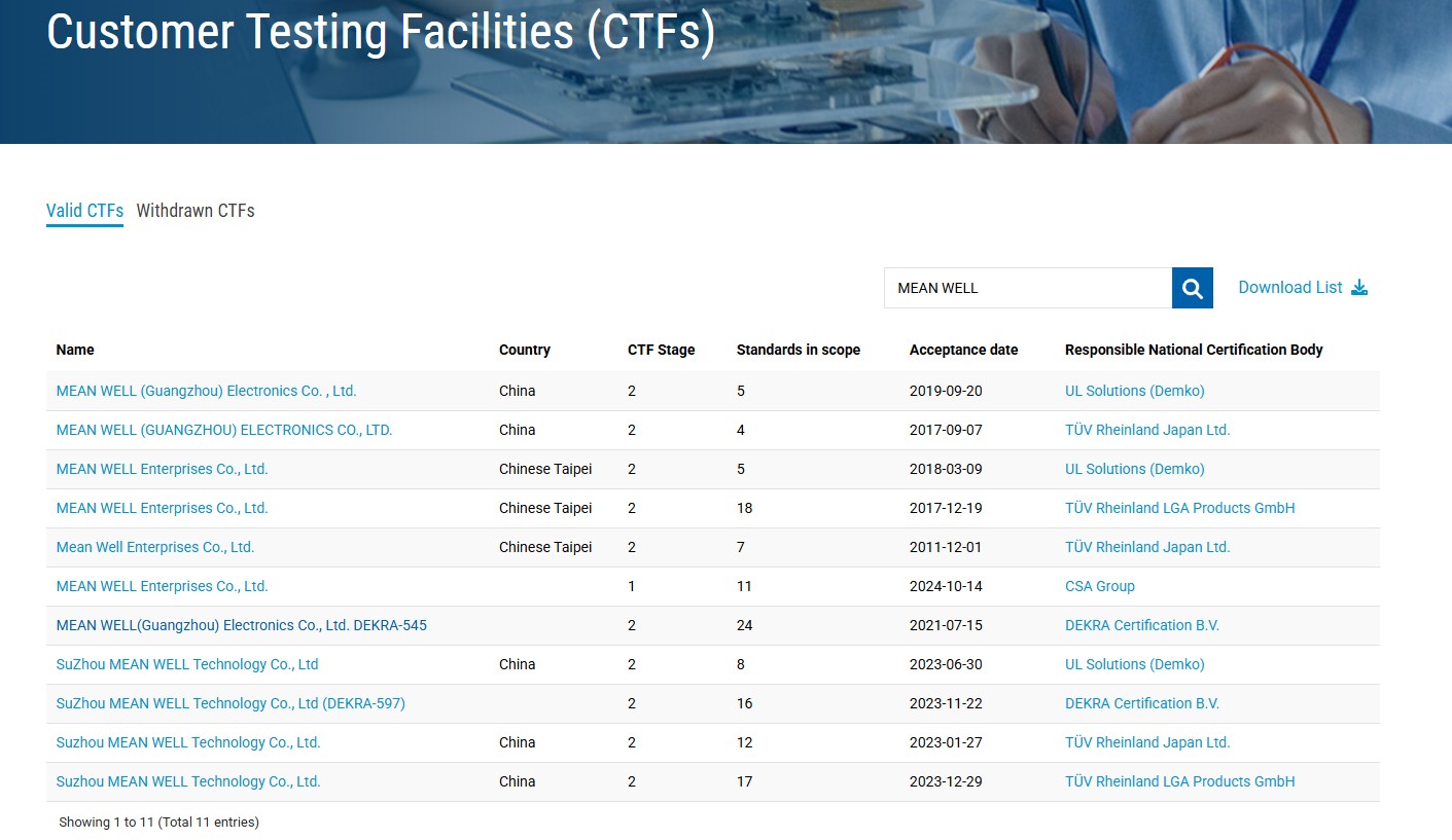 近期,明緯更進一步取得 UL 與 DEKRA 認可之CTDP (WTDP)及 CTF(Customer Testing Facility)IEC/UL ANSI/AAMI ES 60601-1醫(yī)療安規(guī)實驗室資格,象征明緯在醫(yī)療電源與高可靠度產(chǎn)品領域的安規(guī)實力,已達國際認證機構高度信賴的水平。在 UL 體系中,UL WTDP(Witness Test Data Program)與 UL CTDP(Client Test Data Program)同樣是建立于信任與能力評鑒基礎上的制度。WTDP 允許企業(yè)在 UL 見證下執(zhí)行測試,而 CTDP 則進一步授權合格實驗室可自行完成測試并提交數(shù)據(jù),縮短產(chǎn)品驗證時程。CTF 制度源自 IECEE CB 體系,允許通過審核的企業(yè)在自有實驗室依 IEC 標準進行測試,其測試結果可直接用于多國 CB 認證,大幅提升認證效率。此次明緯獲得 UL 與 DEKRA 的CTDP (WTDP)及 CTF認可,正是對明緯實驗室管理制度、技術能力與質量紀律的高度肯定。