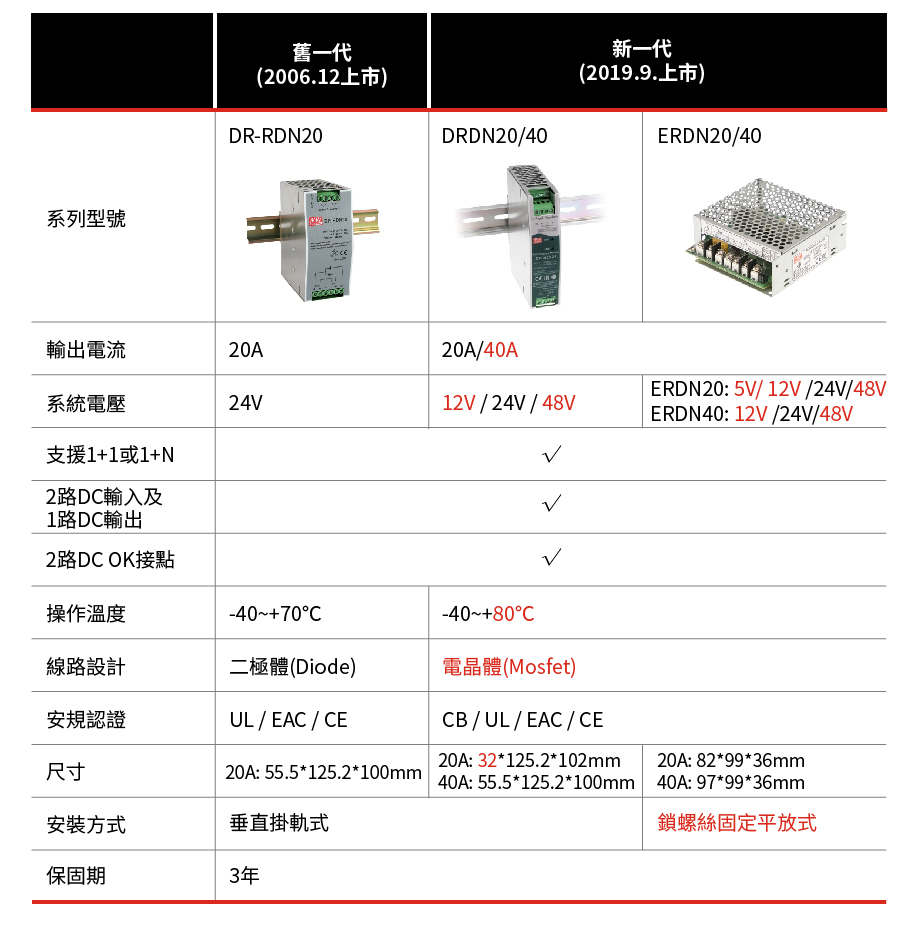 因?yàn)槿哂喈a(chǎn)品需求越來越多,舊款冗余模塊的體積與效能無法滿足需求,明緯新開發(fā)了次世代軌道型可快速掛軌的DRDN20/40系列,并同時(shí)規(guī)劃了采鎖螺絲固定的機(jī)殼型ERDN20/40系列,新舊世代詳細(xì)差異如圖三所示。