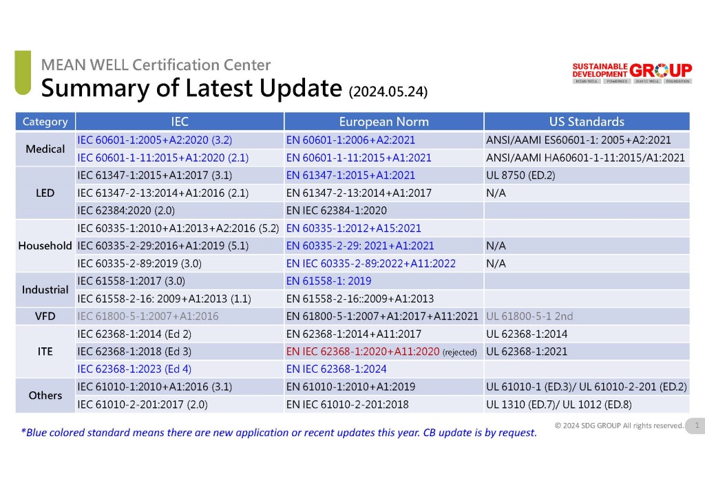 明緯產品 62368 ES PS LPS 等級 及61558 OVC 60335 符合清單